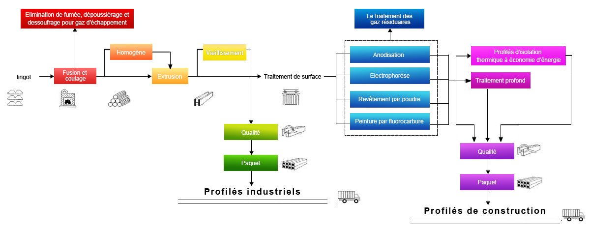 JMA possède un ensemble complet des opérations technologiques de production et des équipements mécaniques en matière de R&D et de conception de profilés en aluminium, de coulée, d'extrusion, de conception & fabrication de moules, de traitement de surface (oxydation, électrophorèse, revêtement à poudre, peinture par fluorocarbure), d’usinage de profilés d'isolation thermique, de traitement profond de portes, de fenêtres et de murs-rideaux…etc., elle dispose des cha?nes de production de tout procédé de profilés en aluminium avec d'autres procédés auxiliaires associés, et d’un ensemble complet de procédés technologiques et des ateliers de production. Ses produits principaux sont comme suit : matériaux de base, profilés anodisés, profilés à dép?t par électrophorèse, profilés à revêtement par poudre, profilés à peinture par fluorocarbure, profilés d’isolation thermique, profilé à grain de bois, portes/fenêtres et murs-rideaux en alliage d’aluminium…etc.